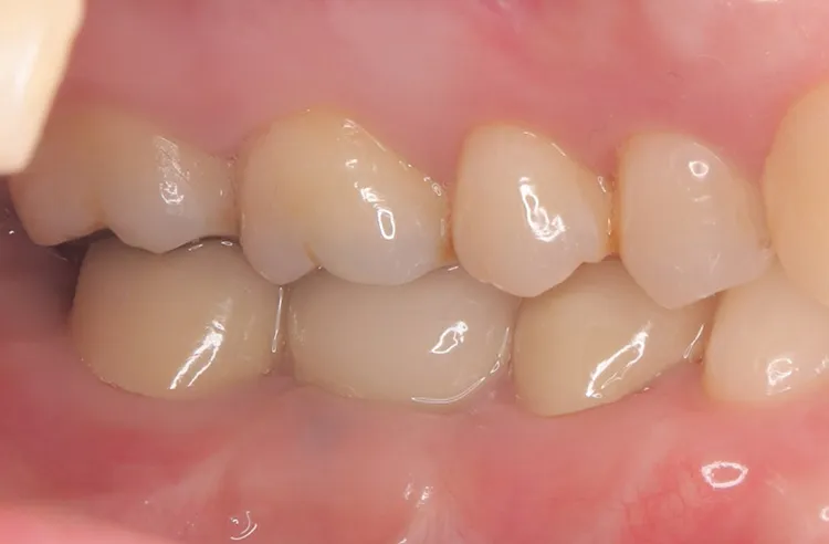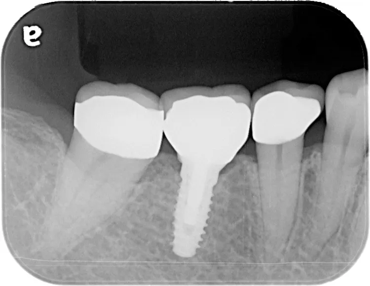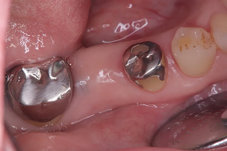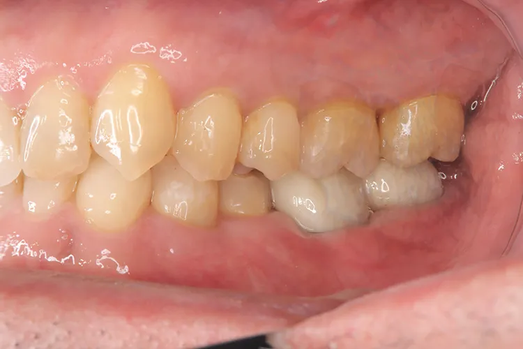 第一大臼歯1歯欠損をインプラントで回復したケースです。第一大臼歯は永久歯の中で一番最初に生える歯ですが、一番早く傷んでしまう歯でもあります。噛む力の60%を負担し噛み合わせの安定に大きく影響しますので、この歯が欠損すると噛み合わせに悪い影響を与えてしまいます。インプラントで治すことにより噛み合わせが安定するだけでなく、ブリッジのように隣在歯を削らないので天然歯の寿命を延ばすメリットもあります。