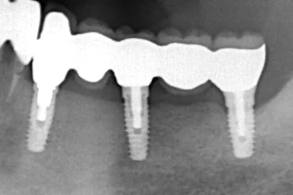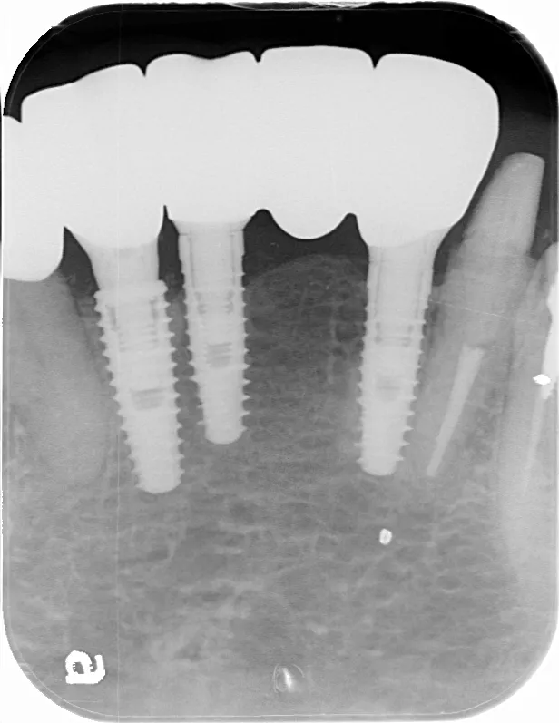 左下5本欠損した部分をインプラント3本埋入して5本ブリッジで治したケースです。なかなかインプラントに踏み切れず、長い間入れ歯を使っておられましたが、噛みごたえがなく好きなものが食べれない上に、度々歯茎が痛んでは調整の繰り返しで快適に過ごすことができず、QOLの向上のためインプラント治療を決断されました。今ではなんでも食べれるとのことで、入れ歯で我慢しないでもっと早くインプラントにすればよかったと言っておられます。