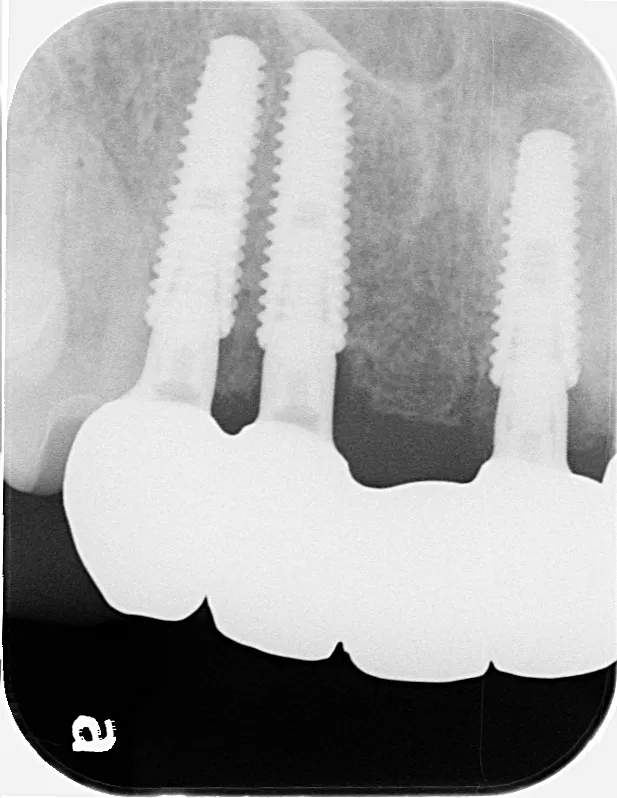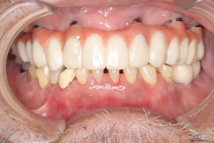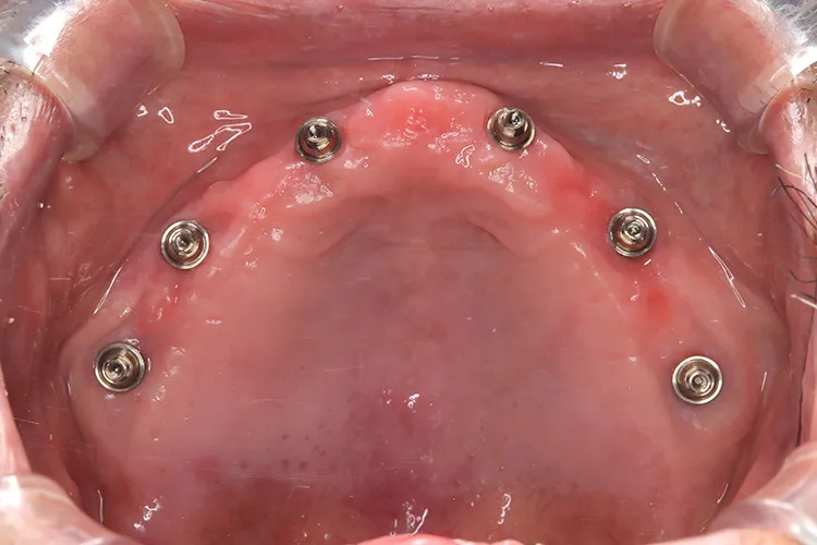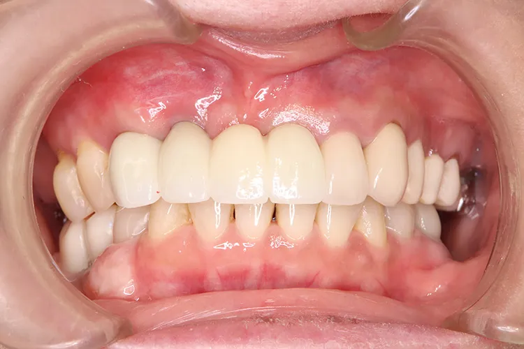 上顎の総入れ歯が不安定で固定式を希望され、インプラント6本で上部構造を支えるボーンアンカードブリッジを選択されました。インプラント埋入したその日にそれまで使用していた入れ歯をインプラントに固定させました。その後歯肉が治癒した段階で最終の上部構造(14本ブリッジ)を装着しました。