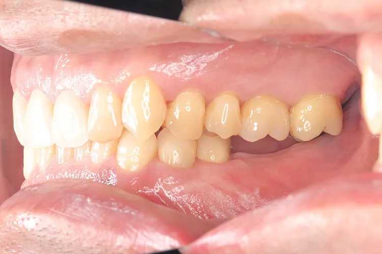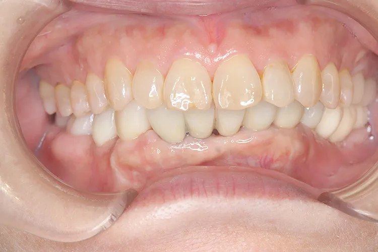 歯ぎしり・食いしばりが強い方の治療ケースです。全体的に歯が擦り減り正面から見て下の歯が見えないほど噛み合わせの高さが失われており、顎関節にも症状がでていました。ヒビが入って保存不可の歯を抜歯しインプラントを計5本埋入し、前歯・臼歯にインプラント土台のブリッジを入れることで噛み合わせの高さを回復しました。古い金属の被せ物もジルコニアでやりかえました。噛み合わせの高さが改善したことで顎関節症状もなくなり快適に過ごされています。歯ぎしりがある方は、夜間のナイトガード装着が必要になります。