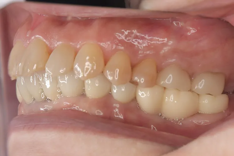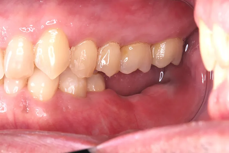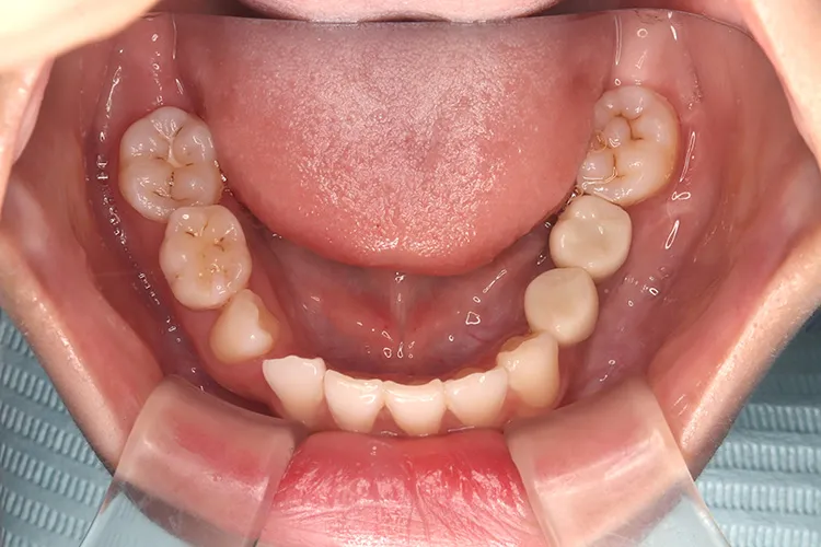 左下の大臼歯の欠損を長期間放置したために上の歯が下がってきてしまい、他の歯医者で被せを入れることができないと断られうちに来られました。下がってきてしまった上の奥歯を部分矯正で上に引っ張り上げ、下に被せ物を入れるスペースを作り、インプラントを入れて噛み合わせを回復しました。部分矯正開始から1年半で治療完了しました。