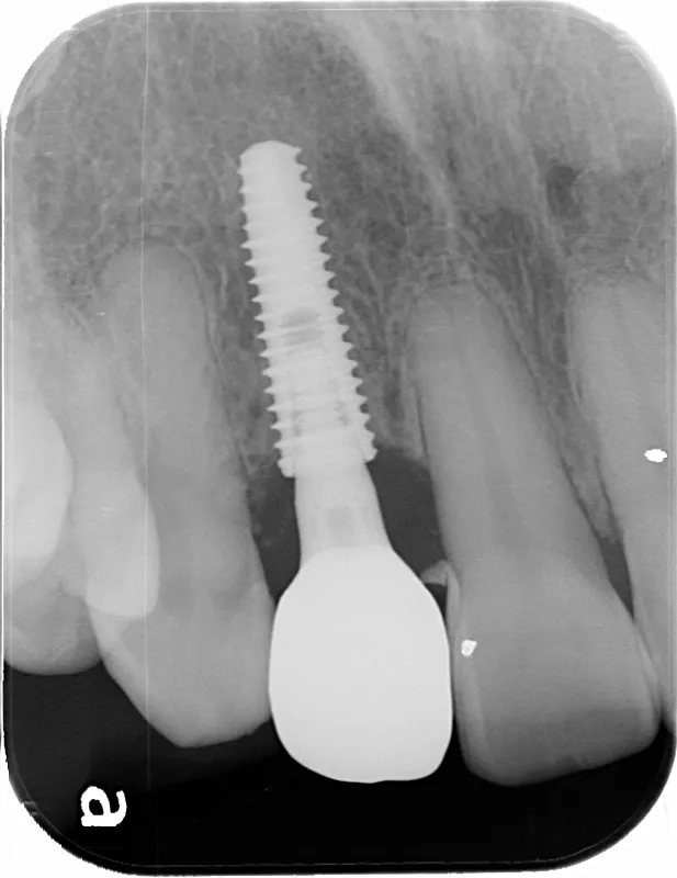 怪我で歯が折れてしまったケースです。前歯なので抜歯即時埋入で対応しました。即時で仮歯まで入れ、見た目の回復を行いました。その後歯肉が治りインプラントが安定したタイミングで最終の被せ物を装着しオペから3ヶ月で治療完了しました。