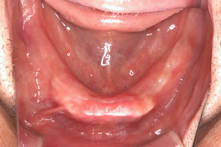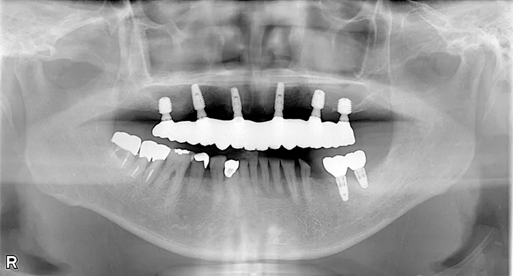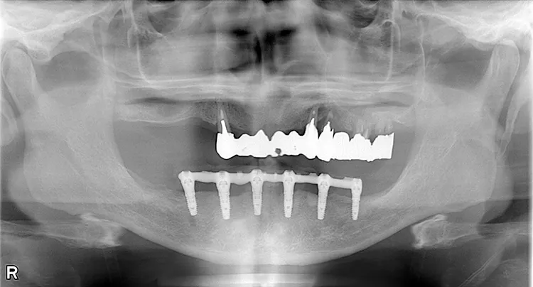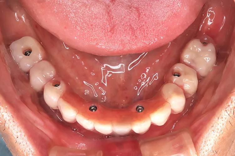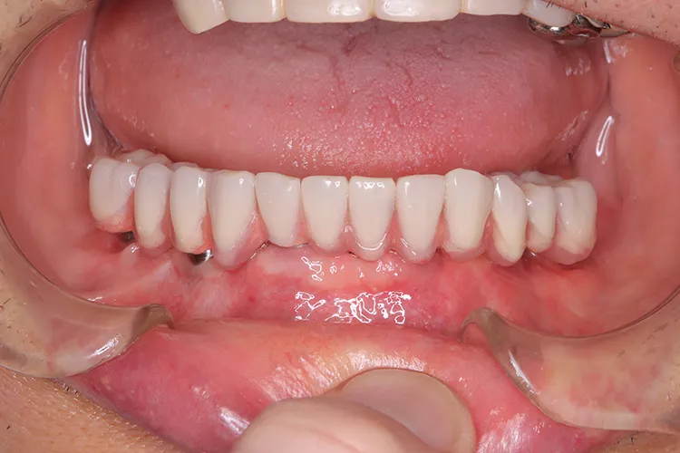 ボーンアンカードブリッジの下顎症例です。同じようにインプラント6本で上部構造を支えることができます。