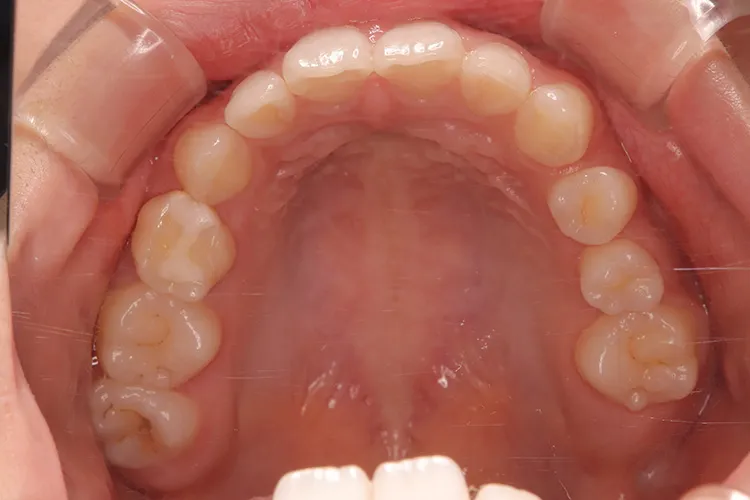 20歳の患者様の永久歯先天欠如のケースです。右上4・右下5・左下45の他、第二大臼歯も3本先天欠如していました。年齢も若いため、歯を傷める可能性の高いブリッジは選択されず、長期間安定して機能するインプラントを選択されました。このように若年者で永久歯が先天欠如しているケースにも応用できます。
